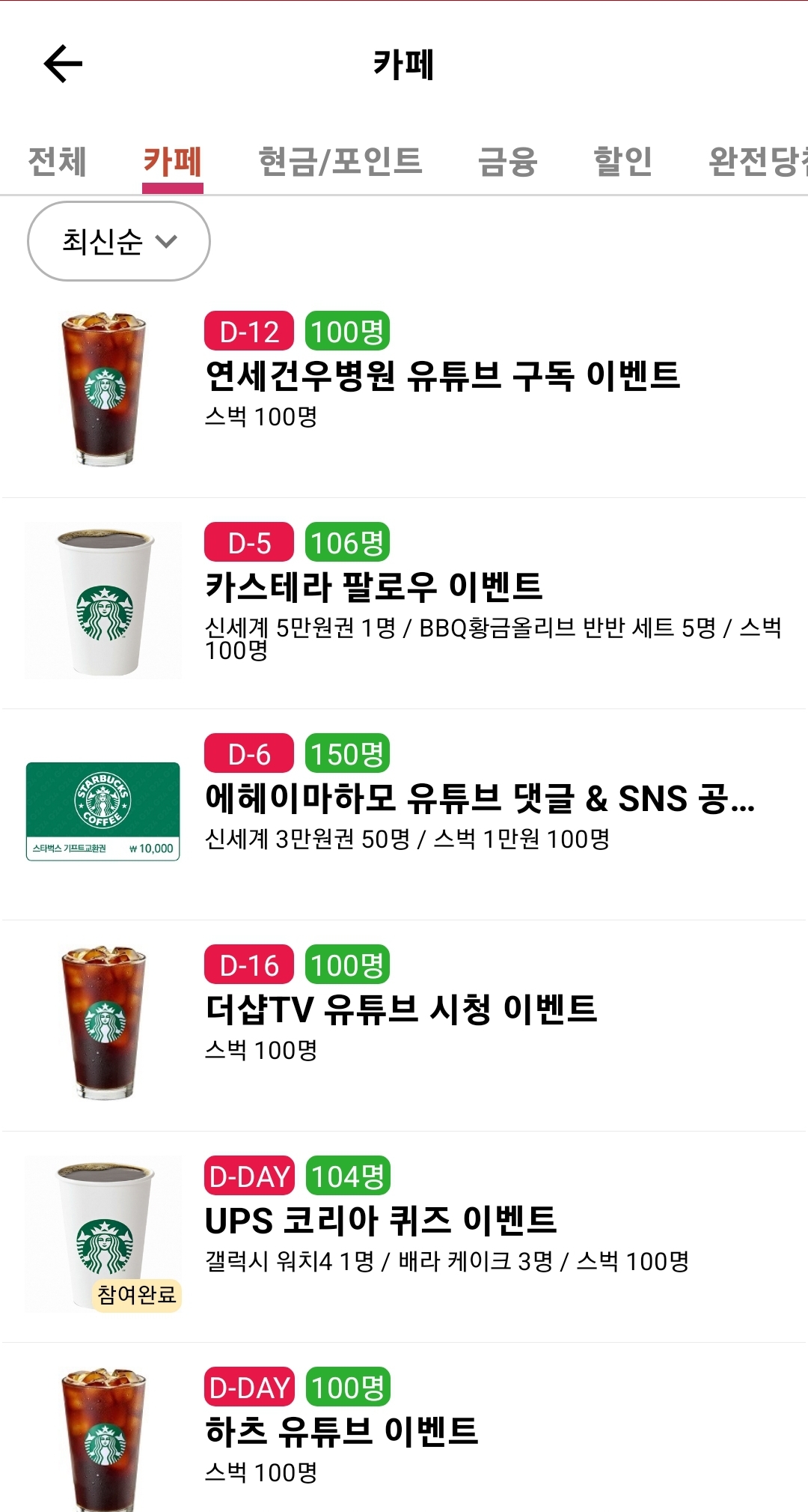 카페, 현금/포인트, 금융, 할인등 여러 이벤트에 응모해서