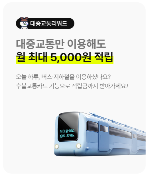1. 대중교통 리워드 : 월 3만원 이상 대중교통 이용시 교통비 10%리워드