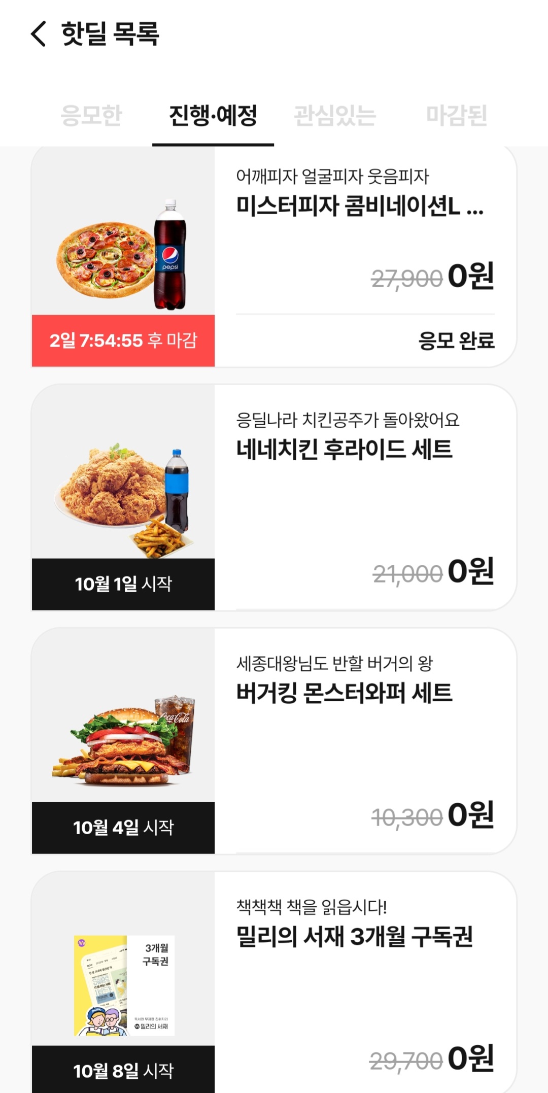 핫딜 예정 목록도 볼 수 있으며 0원이니 부담없이 응모하세요.